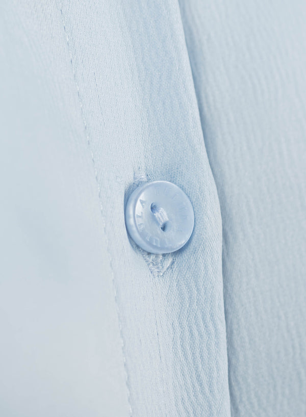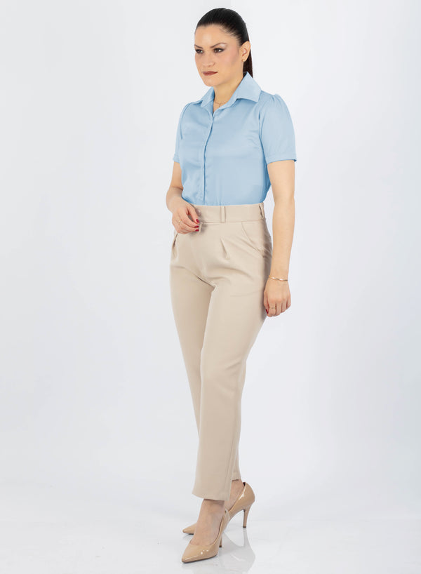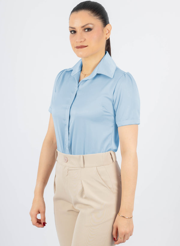 Blusa de diseño elegante y minimalista, confeccionada en seda Chrissy, un tejido suave, liviano y con acabado satinado. Presenta cuello camisero clásico, manga corta con caída fluida y botonadura frontal al tono.