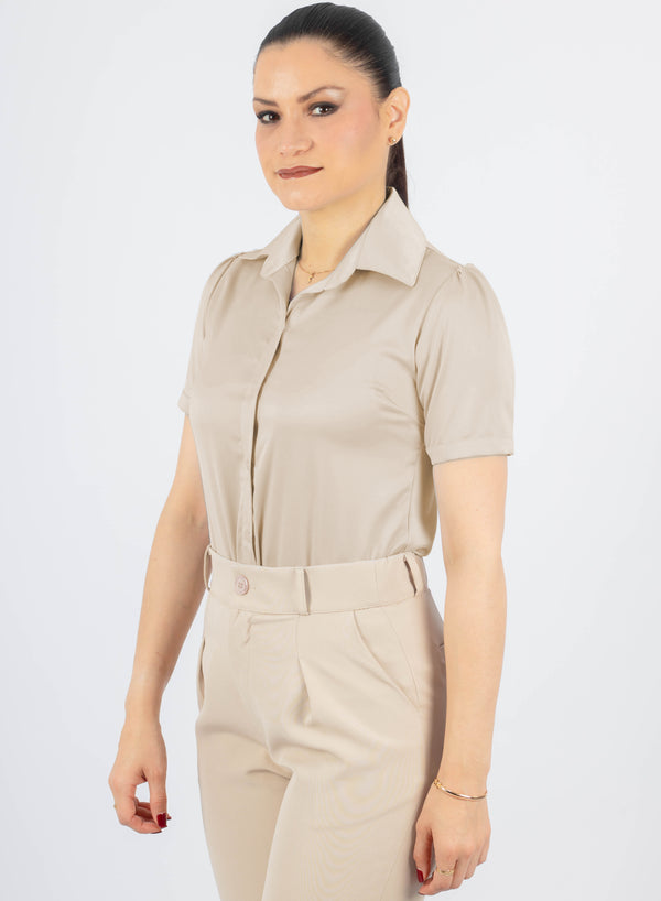 Blusa de diseño elegante y minimalista, confeccionada en seda Chrissy, un tejido suave, liviano y con acabado satinado. Presenta cuello camisero clásico, manga corta con caída fluida y botonadura frontal al tono.