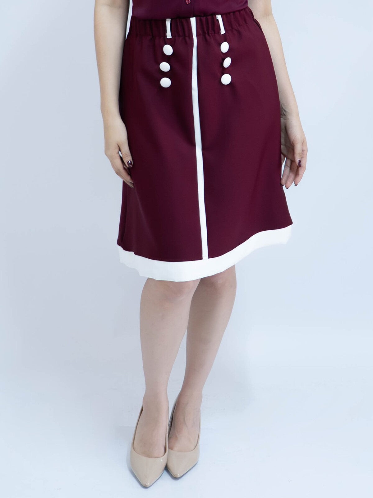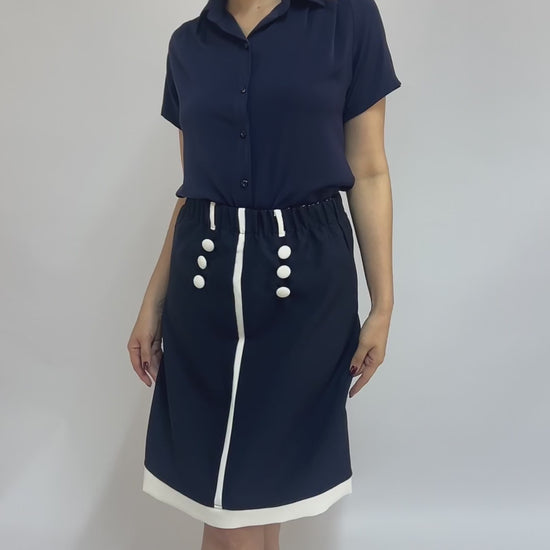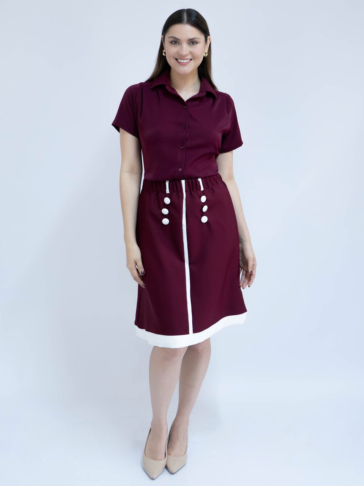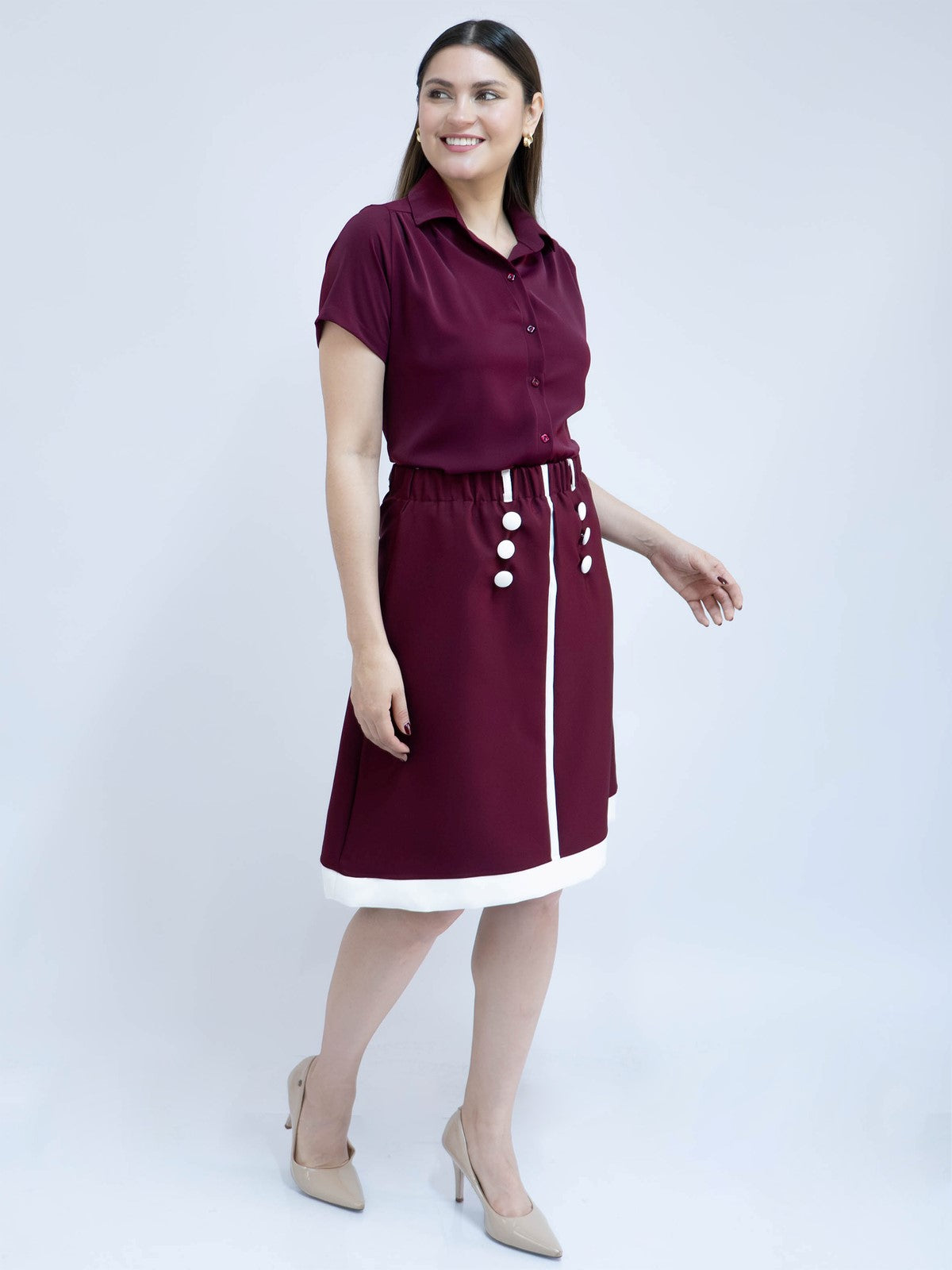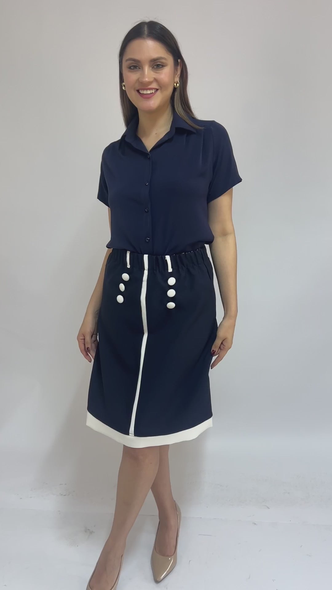 - Corte: Corto, sobre la rodilla, con pretina definida.