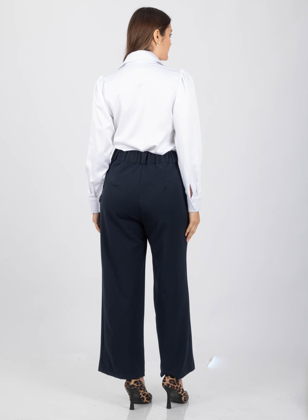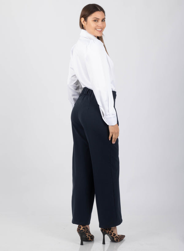 Este pantalón de vestir para mujer combina elegancia y comodidad, perfecto para realzar tu estilo en cualquier ocasión. Su diseño con pliegues frontales y pretina ancha con botón decorativo crea una silueta sofisticada y favorecedora