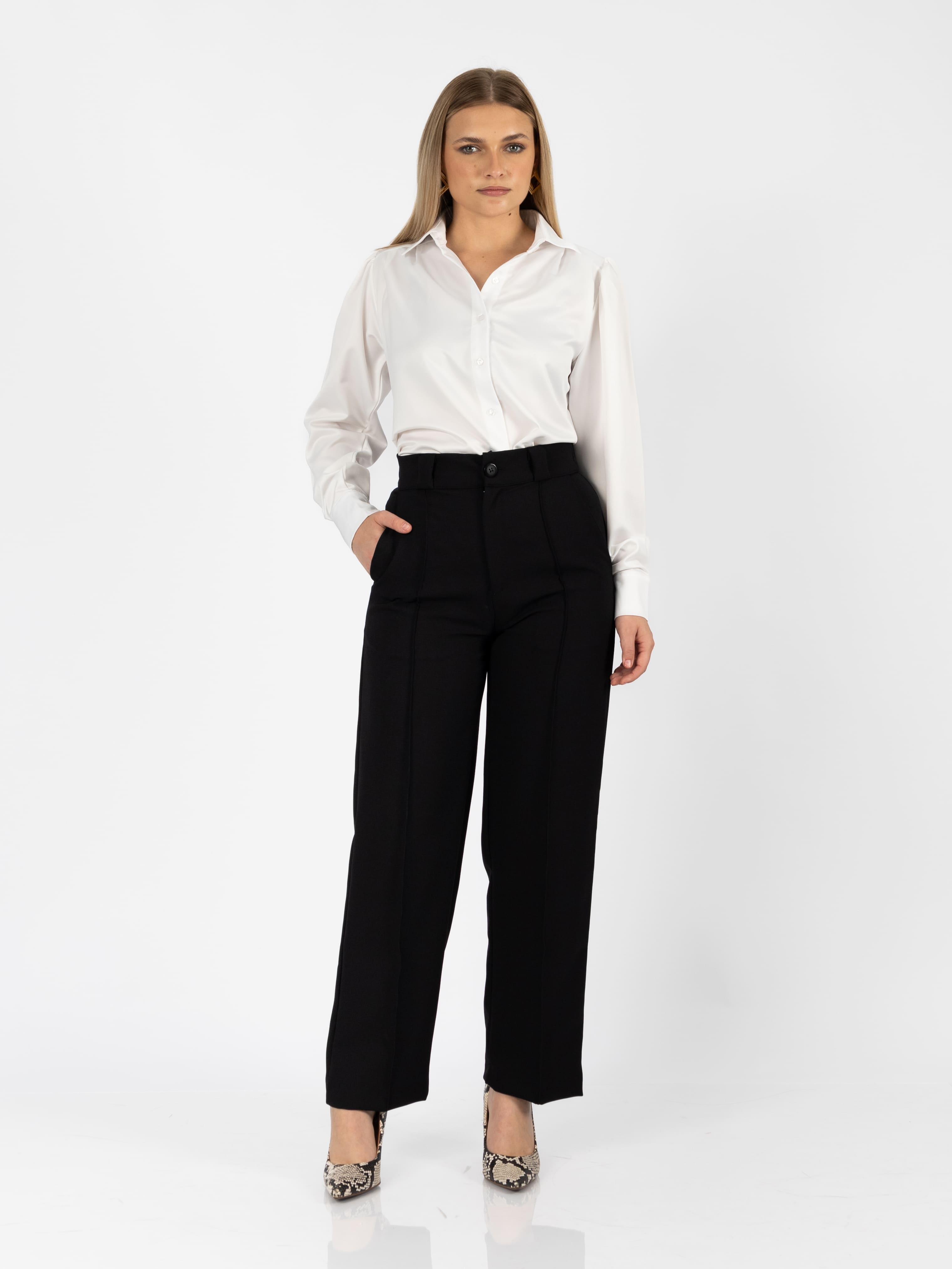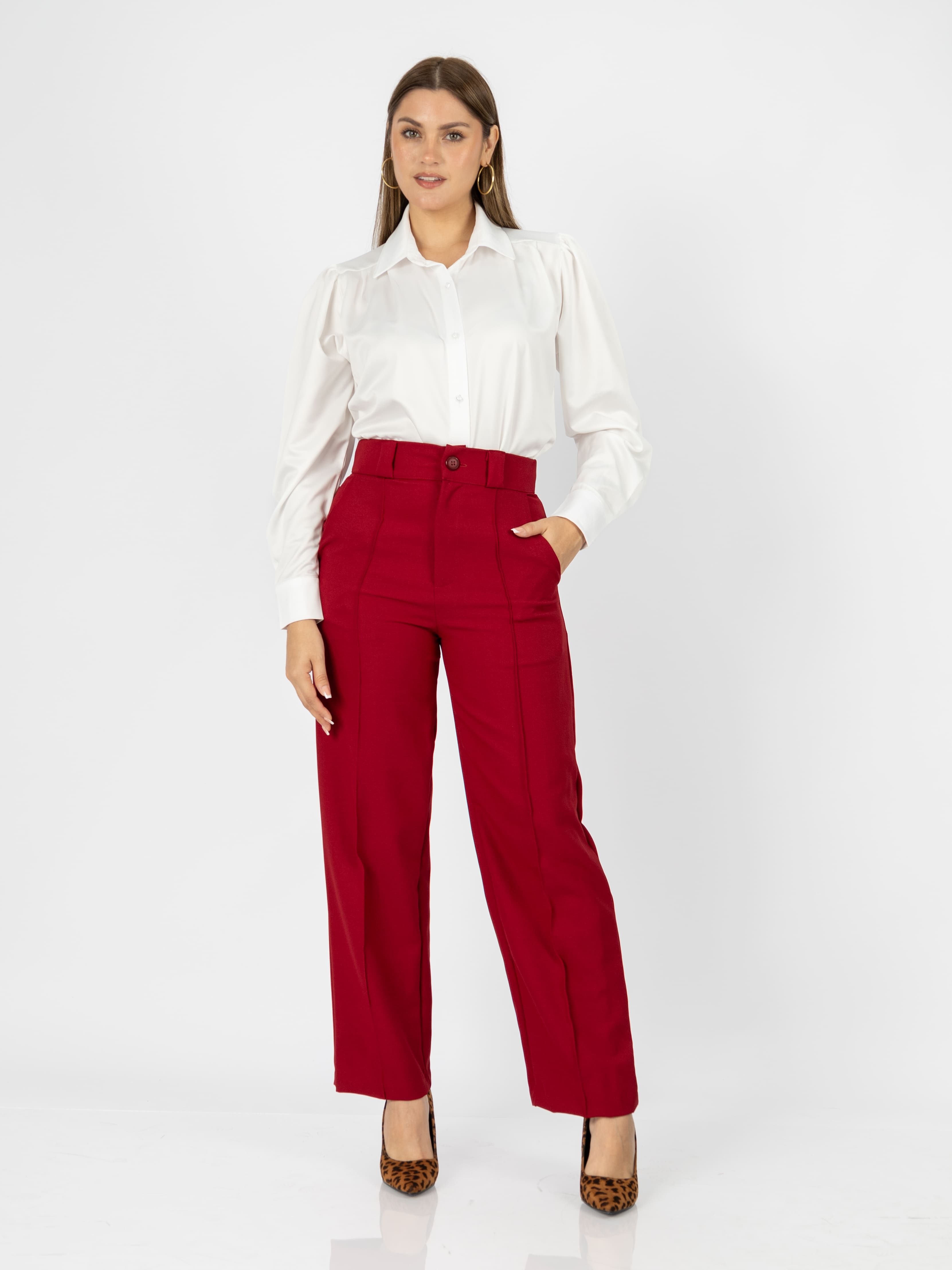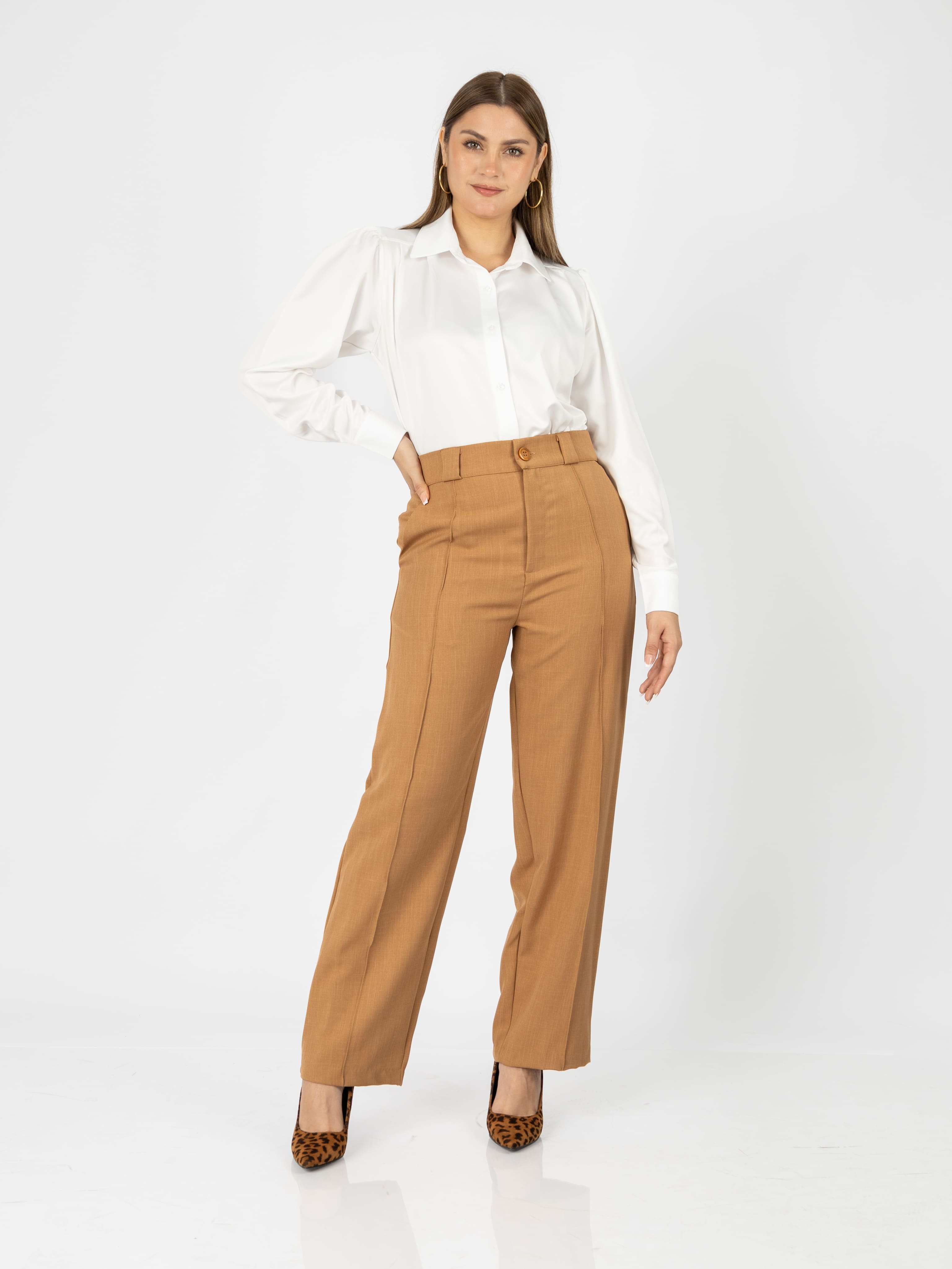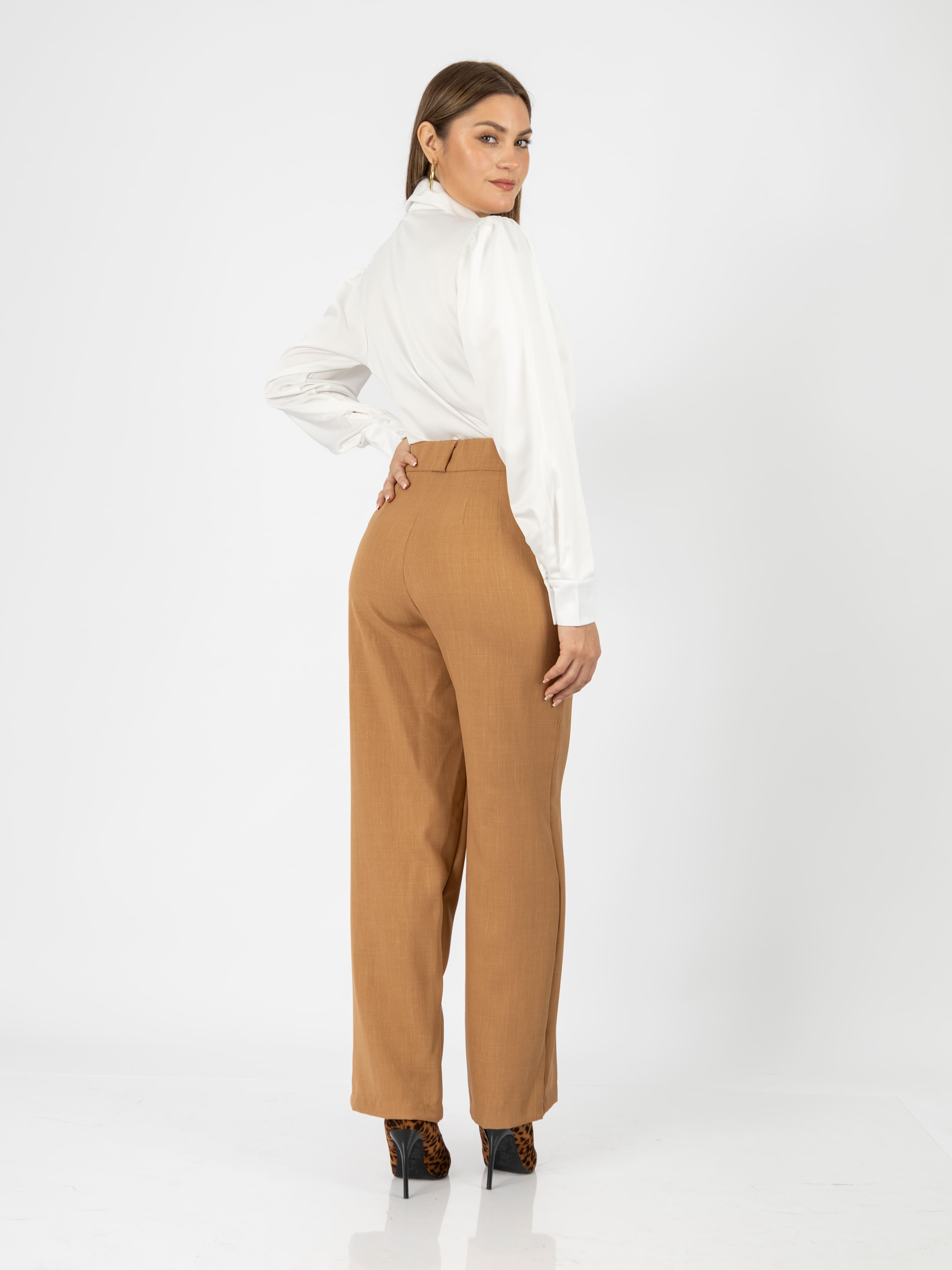 Su diseño incluye pinzas delanteras, pretina ancha con botón forrado y bolsillos funcionales, lo que lo convierte en una prenda tan práctica como elegante. Ideal para la oficina, una reunión casual o una salida especial, este pantalón combina a la perfección con blusas, tops o camisas clásicas.