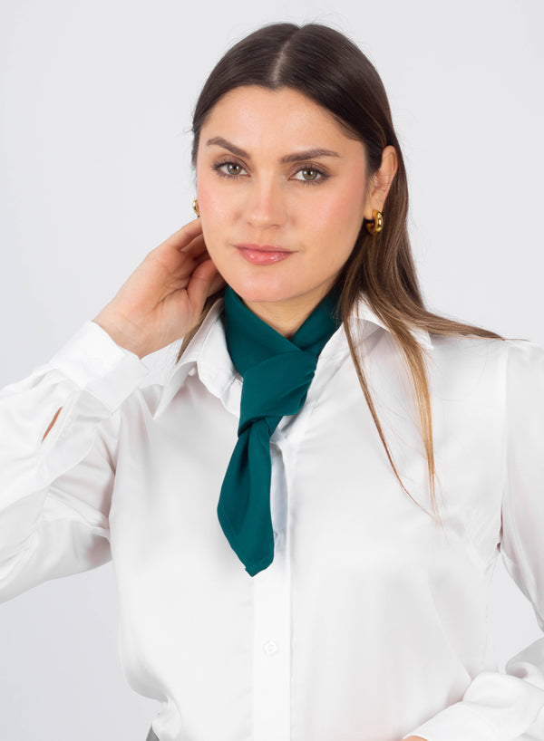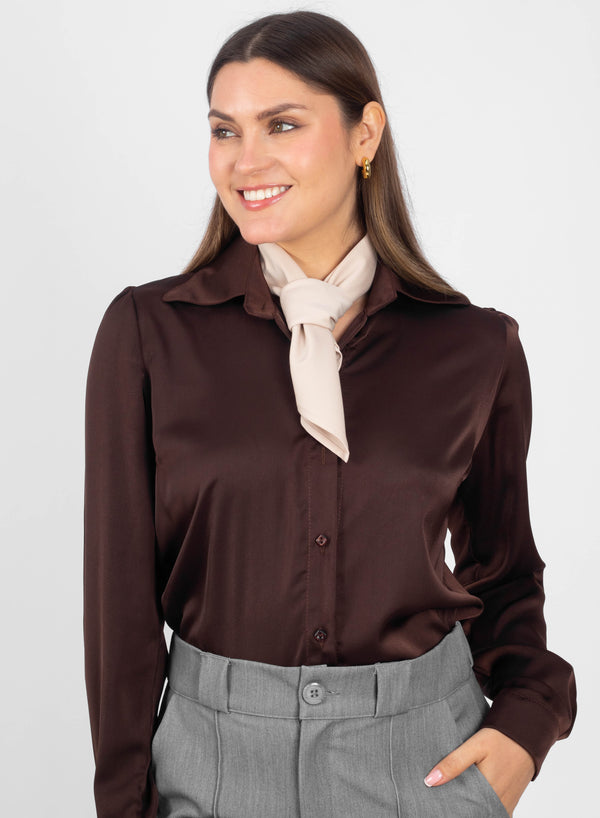 Un accesorio versátil y sofisticado que eleva cualquier outfit. Confeccionado en seda sintética suave al tacto, este pañuelo destaca por su caída ligera y su brillo delicado, ideal para complementar blusas, sacos o abrigos.