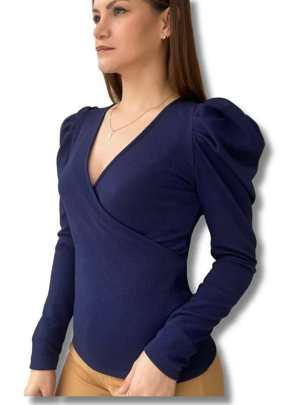 Eleva tu estilo corporativo con este elegante Top Fernanda de trabajo para mujeres. Con mangas princesa y un favorecedor cuello en V, confeccionado en tela "Yakar", tiene textura, no trasluce y es stretch.